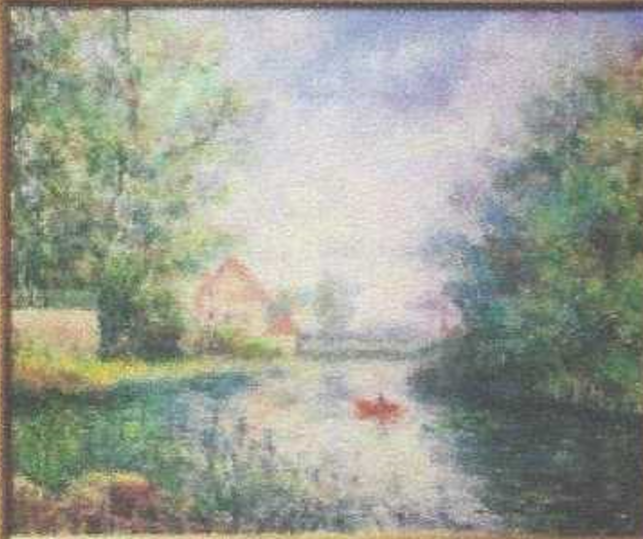 “La Petite Manufacture” is an example of Post French Impressionism painted by Hughes Claude Pissarro AKA “Petite Claude”; a name given to Pissarro for his post Impressionist work. His work, after deciding to take a new direction, got him the tag “Grand Claude”, and accompanied his new identity “Isaac Pomié”.