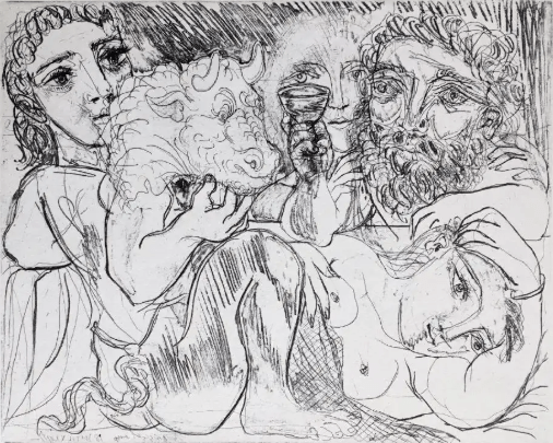 Picasso usually depicted himself as the Minotaur ravaging a maiden. But here, there is a sculptor as well. It is as if the beast, the man and the maidens, who, can sometimes be subjects of study, and at others, subjects of lust, are all enjoying a more heady and intellectual interaction. Regardless, it is a magnificent example of the master’s drauftsmanship.
